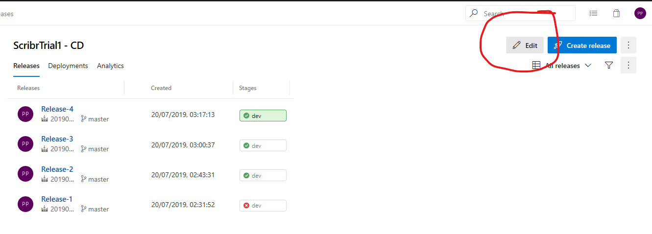 Now comes the waiting game. Complete the setup and wait for an initial release of the build to complete. It will fail in the final stage because in step 3, we specified our path to application code as "build/" but that folder does not yet exist. We need to ask npm to build the project first. Click on the Failed link and follow the images below to get to the stage where you modify a pipeline.