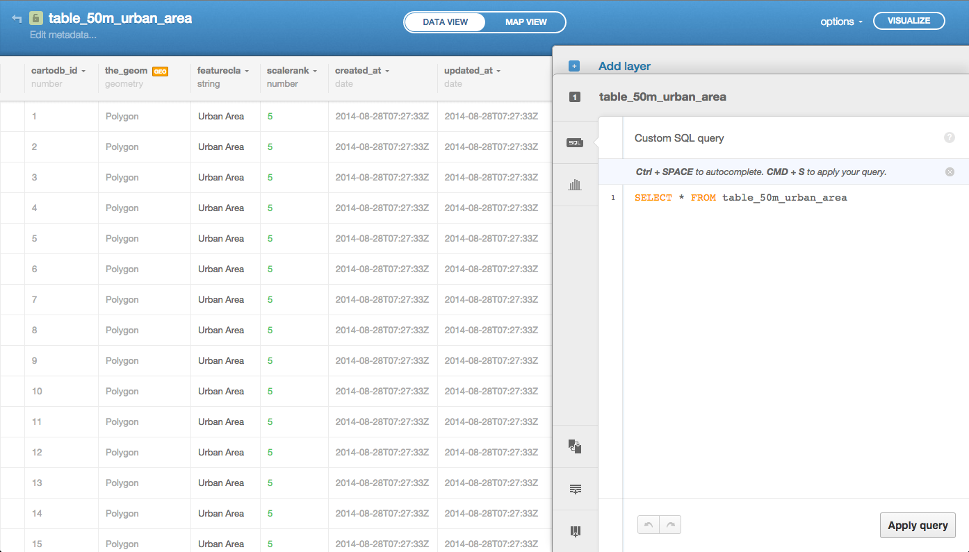 After it is uploaded, you can visualize it in a table or on a map, search it using SQL, and apply map styles using CartoCSS. You can even access it using the CartoDB API OVERVIEW and SQL API, or export it to a file.