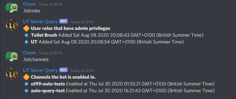 - .listroles Displays a list of roles that can use the bots admin commands.