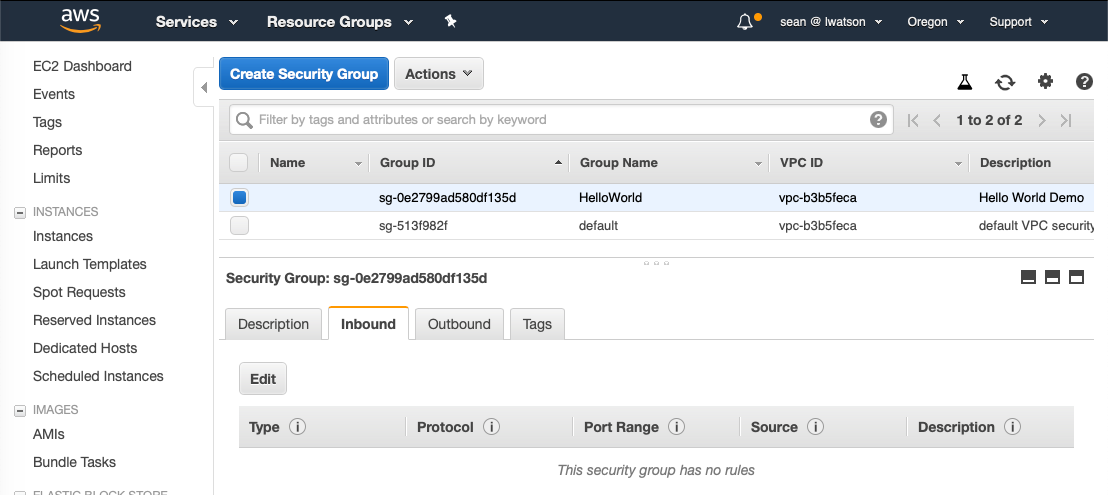 sean@vubuntu:~$ aws ec2 create-security-group --group-name HelloWorld --description "Hello World Demo" --vpc-id vpc-b3b5feca { "GroupId": "sg-0e2799ad580df135d" }