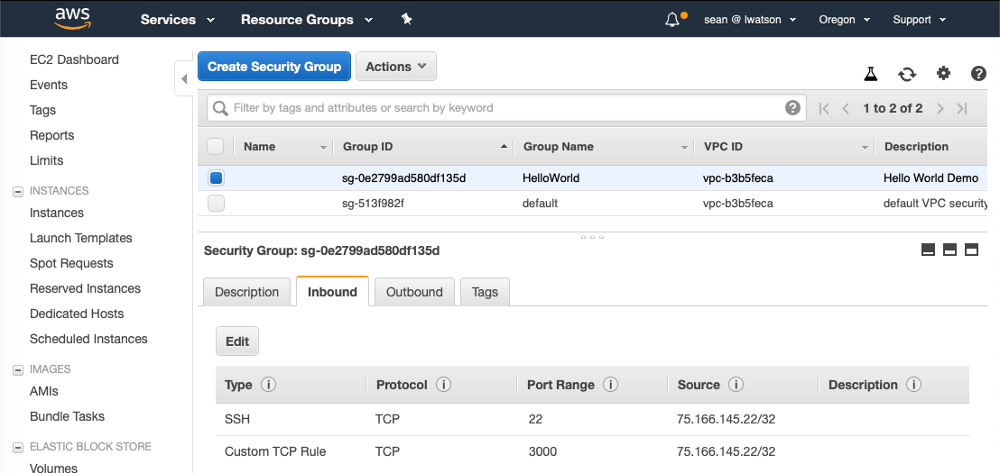 sean@vubuntu:~$ aws ec2 describe-security-groups --group-names HelloWorld --output table ---------------------------------------------------------------------------------------------- | DescribeSecurityGroups | +--------------------------------------------------------------------------------------------+ || SecurityGroups || |+------------------+------------------------+-------------+---------------+----------------+| || Description | GroupId | GroupName | OwnerId | VpcId || |+------------------+------------------------+-------------+---------------+----------------+| || Hello World Demo| sg-0e2799ad580df135d | HelloWorld | 404297683117 | vpc-b3b5feca || |+------------------+------------------------+-------------+---------------+----------------+| ||| IpPermissions ||| ||+----------------------------+----------------------------------+------------------------+|| ||| FromPort | IpProtocol | ToPort ||| ||+----------------------------+----------------------------------+------------------------+|| ||| 22 | tcp | 22 ||| ||+----------------------------+----------------------------------+------------------------+|| |||| IpRanges |||| |||+--------------------------------------------------------------------------------------+||| |||| CidrIp |||| |||+--------------------------------------------------------------------------------------+||| |||| 75.166.145.22/32 |||| |||+--------------------------------------------------------------------------------------+||| ||| IpPermissions ||| ||+----------------------------+----------------------------------+------------------------+|| ||| FromPort | IpProtocol | ToPort ||| ||+----------------------------+----------------------------------+------------------------+|| ||| 3000 | tcp | 3000 ||| ||+----------------------------+----------------------------------+------------------------+|| |||| IpRanges |||| |||+--------------------------------------------------------------------------------------+||| |||| CidrIp |||| |||+--------------------------------------------------------------------------------------+||| |||| 75.166.145.22/32 |||| |||+--------------------------------------------------------------------------------------+||| ||| IpPermissionsEgress ||| ||+----------------------------------------------------------------------------------------+|| ||| IpProtocol ||| ||+----------------------------------------------------------------------------------------+|| ||| -1 ||| ||+----------------------------------------------------------------------------------------+|| |||| IpRanges |||| |||+--------------------------------------------------------------------------------------+||| |||| CidrIp |||| |||+--------------------------------------------------------------------------------------+||| |||| 0.0.0.0/0 |||| |||+--------------------------------------------------------------------------------------+|||
