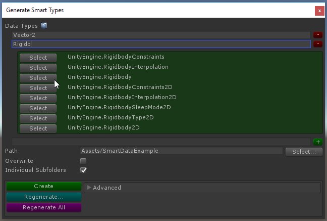 The type generator / regenerator has changed slightly. Please make sure you're backed up, update to the latest commit, use Create > SmartData > Generate Types > Regenerate... and double check the changes made. This update is to support moving generated files around - SmartData will from now on regenerate files in-place.