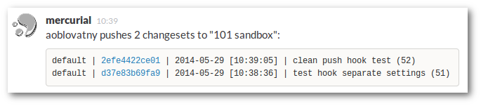 webhook_urlis your unique webhook URL.repo_nameis a name of your repository. It's optional.commit_urlis a part of URL for parcilular changeset. If it is specified, link to a changeset will be inserted in description of changeset. Plain text short revision number will be used otherwise.usernameis the displayed name. Default:mercurial.icon_emojiis the name of emoticon, which will be displayed. It's optional. You can useicon_urlinstead.icon_urlis a direct link to image, which will be displayed. It's optional. You can use this icon URL if you want.